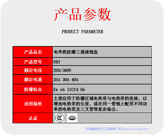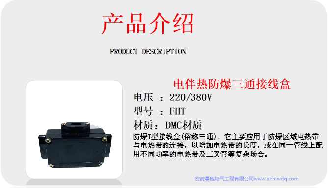 防爆三通接線盒(俗稱T型接線盒)。它主要應(yīng)用于防爆區(qū)域電熱帶與電熱帶的連接,以增加電熱帶的長度,或在同一管線上配用不同功率的電熱帶及三叉管等復(fù)雜場合,其外殼為DMC塑料制成。