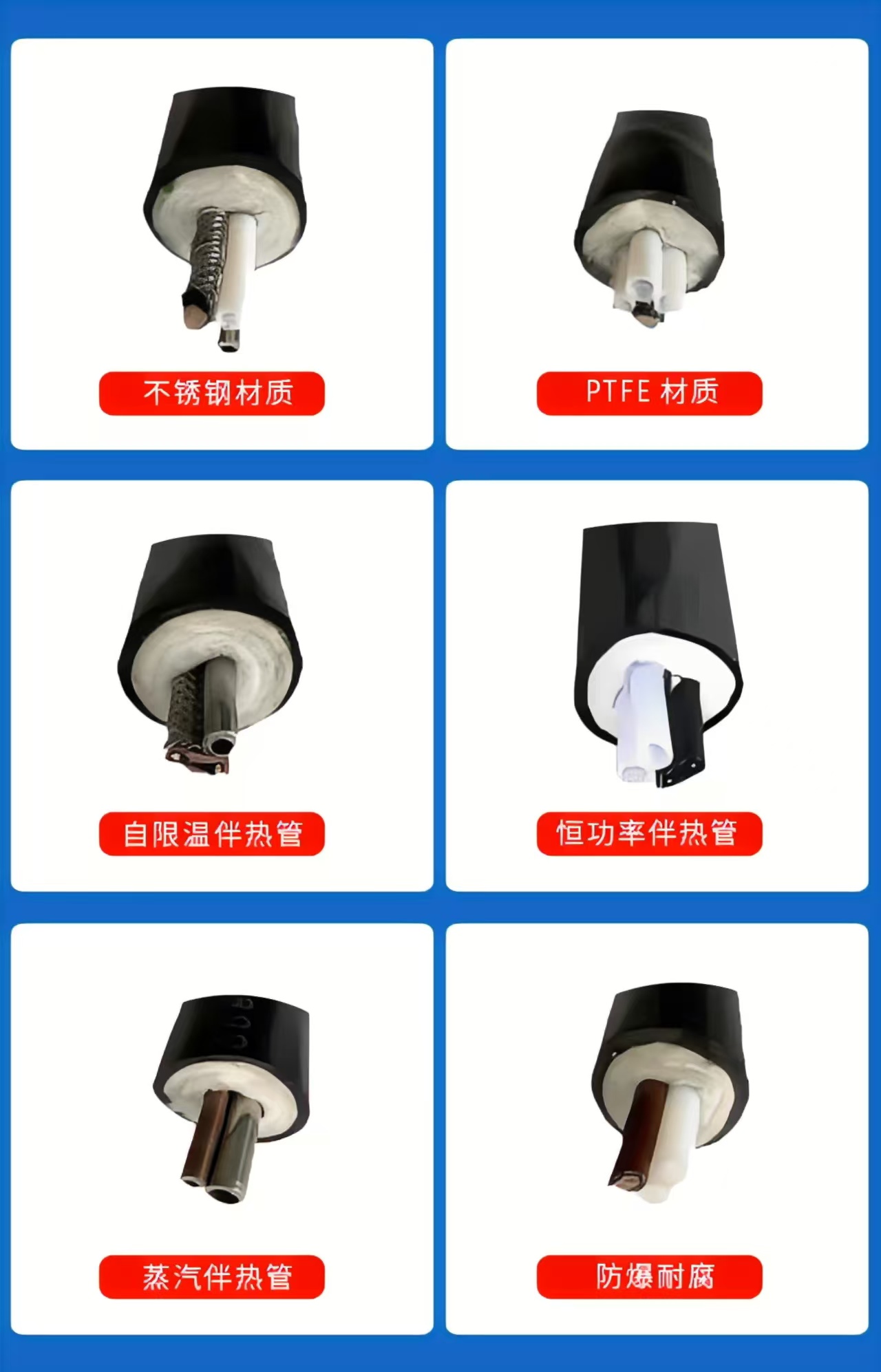 由內到外依次為內芯、保溫層和保護外套。內芯由一組耐腐蝕高性能樹脂導管、電伴熱帶以及補償線纜等組成。保溫層用于減少熱量散失,保護外套一般采用阻燃聚乙烯(PE)材料,起到保護和阻燃的作用。